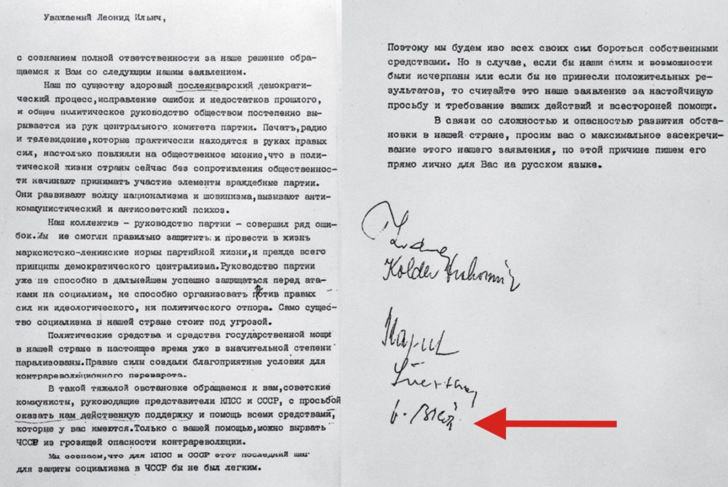 A letter from those hardliners, in Russian (above), purported to “invite" Soviet forces in ... because of the “danger to the very existence of socialism in our country” that Dubcek’s reforms represented. I caught an echo, from my local reporting, in the name of one signatory (arrowed above, the last name signed).