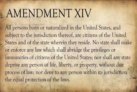 The prime movers in the argument against that right of citizenship by birth, which was created by the 14th Amendment to the Constitution (aboveright) after the Civil War, in 1868, have recently been Trump followers who’ve made much ballyhoo about ‘Birth Tourism’ – the practice of visitors coming here and bearing children. There are probably about 33,000 such cases in a given year – I’m not sure that this counts as a national emergency in a country of three-hundred-and-fifty million people. But there we are … it’s clearly an issue for the angry and aggrieved movement..